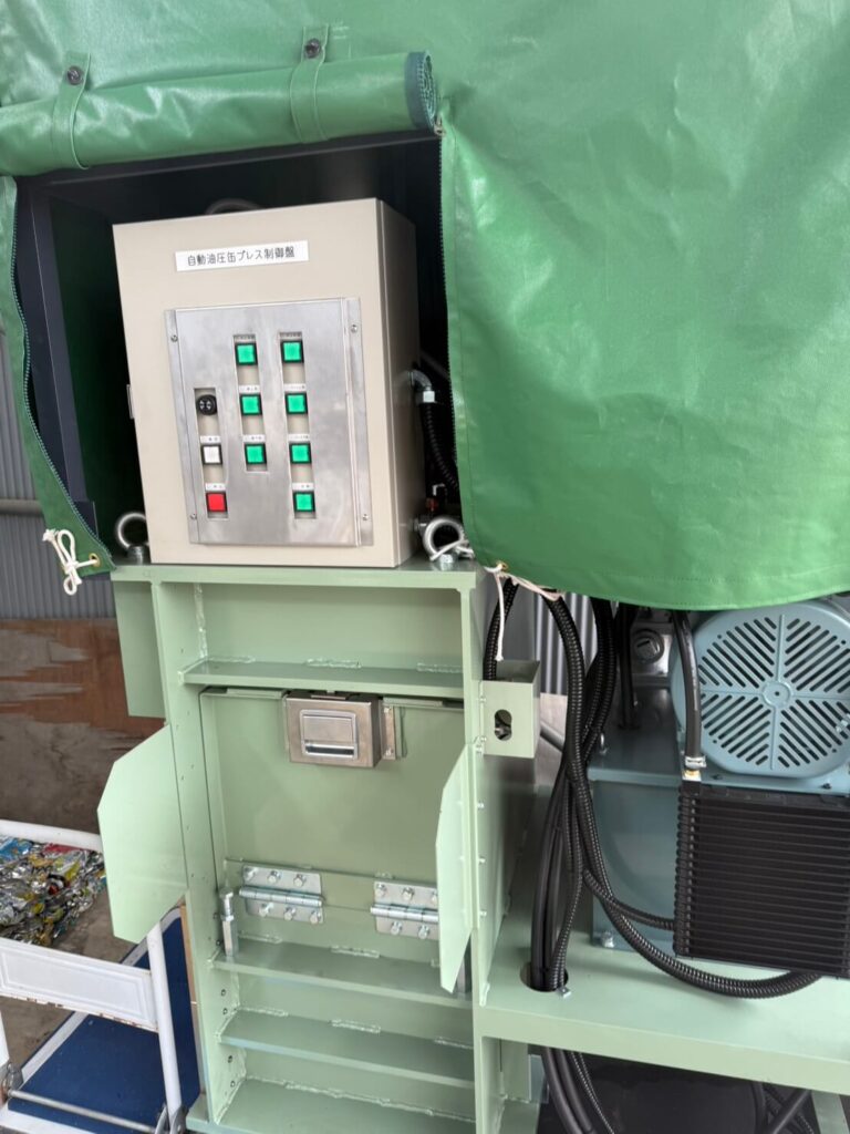 工場内には、缶を効率よく圧縮する最新のプレス機を設置しました。 操作性・安全性ともにアップし、資源のリサイクル処理がよりスムーズになります!