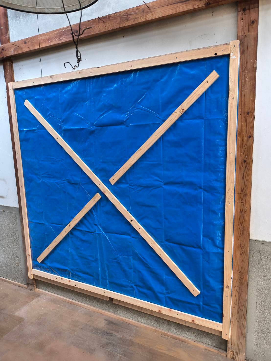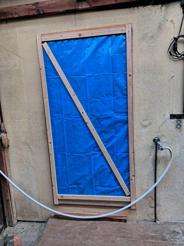 鍵のかからない建具(開き戸・引き戸)をいったん取り外し、開口部の大きさに合わせて木材で枠を組んでしっかり固定しました。そのうえからブルーシートを張りビスで留めることで、雨風の吹き込みと外からの視線をカットしています。