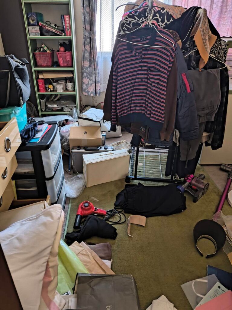 - 洋室に衣類・収納ケース・掃除機・ドライヤーなどの生活用品が床一面に広がった状態