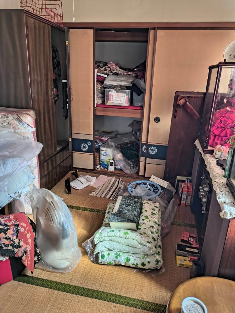 - 和室にはベッド・布団・押し入れ内の衣類・人形ケースなどが残置
