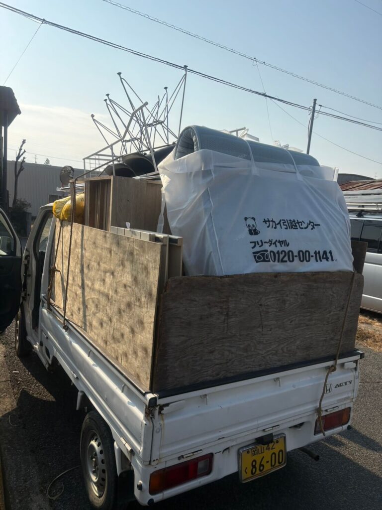 スマイル産業のトラックに、スタッフが効率よく積み込みを行い、これだけの量をトラック1台分の料金で回収完了。荷台いっぱいに積み上がった写真のとおり、「こんなに積めるの?」と驚かれるほどの物量ですが、スタッフの積み込み技術で無駄なくしっかり収めています。
