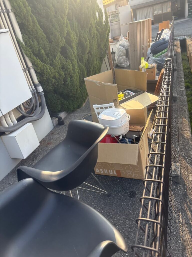 デスク、椅子、炊飯器、段ボールに詰められた小物類など、処分予定の家具・家電・生活雑貨が大量にありました。「自治体の回収では一度に出しきれない」「分別や運搬が大変」とお困りの状態でした。
